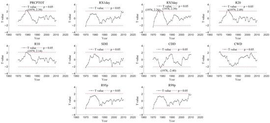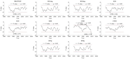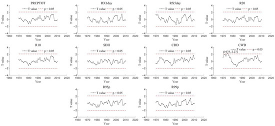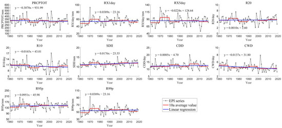 - Zhang, X.; Alexander, L.; Hegerl, G.C.; Jones, P.; Tank, A.K.; Peterson, T.C.; Trewin, B.; Zwiers, F.W. Indices for monitoring changes in extremes based on daily temperature and precipitation data. Wiley Interdiscip. Rev. Clim. Chang. 2011, 2, 851–870. [Google Scholar] [CrossRef]