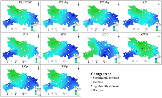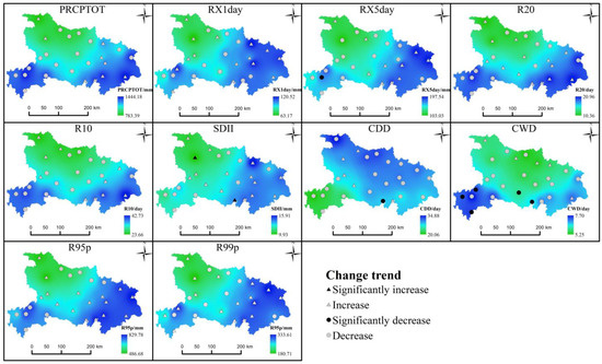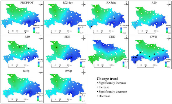 - The changing trend of EPIs in spring and summer was more obvious compared to that on an annual scale, both in temporal and space. The spring RX1day and R99p will be increased in the near future, which indicates that extreme rainstorm events may be increased in spring. Almost all EPIs except CDD would be increased in the recent future, showing that more attention should be paid in summer to the disaster prevention caused by extreme precipitation events;