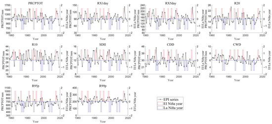 Wang, W.; Tang, H.; Li, J.; Hou, Y. Spatial-Temporal Variations of Extreme Precipitation Characteristics and Its Correlation with El Niño-Southern Oscillation during 1960–2019 in Hubei Province, China. Atmosphere 2022, 13, 1922. https://doi.org/10.3390/atmos13111922