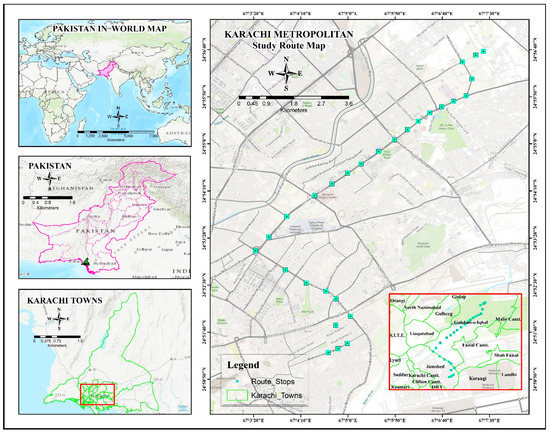 Among various other daily activities, commuting is regarded as the activity with the highest exposure period, especially in urban cities (e.g., Karachi) with high vehicular intensity [8]. Studies suggest that up to 30% of a person’s daily inhalation dose of BC is received from their routine trips [9]. Since pollutant concentrations are higher in the transport microenvironment, commuters may obtain a considerable contribution to their daily BC exposure while traveling in such an environment for even 1.5–2 h per day [8,10,11]. Hence, exposure-based studies prefer real-time monitoring for personal exposure to a pollutant. For this purpose, commuters are equipped with portable real-time monitors to evaluate personal exposure in a particular environment [9,12]. Most of these studies have been conducted in urbanized areas of developed countries [12], whereas investigations based on personal exposure to BC are limited in Pakistan. The studies investigating the emission of BC in Karachi are mostly based upon fixed site monitoring, e.g., research by Malashock et al. (2018) [6], who found associations between BC exposure and cardiovascular diseases (CVD) among residents of Karachi. Other researchers, e.g., Bibi et al. (2017) [13] and Dutkiewicz et al. (2009) [14], reported BC concentrations to be associated with vehicular traffic and meteorological variables, along with seasonal and diurnal variations. In view of the limited information about this important air quality issue, we commenced an in-vehicle monitoring study of personal exposure to BC concentrations along the roadways in Karachi-Pakistan. A comprehensive evaluation of BC emissions in Karachi is especially significant as it is one of the largest pollution hotspots in the country. Pakistan’s largest and most densely populated city, with a population growth rate of 2.27% [15]. Karachi has been subjected to substantial growth of heavy industries and immense utilization of coal. This has resulted in the levels of fine particulate matter averaging 5–7 fold higher than the WHO guidelines [16]. Moreover, Karachi is an overcrowded city of more than 20 million people [3,17] and as of 2013, had an annual traffic circulation of about 6.3 billion commuters in the city’s public transport system [3].