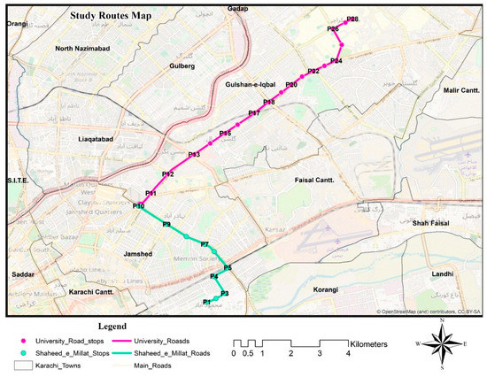 Road map of the selected routes. Shaheed-e-Millat Road (P1–P10) and Main University Road (P11–P28).