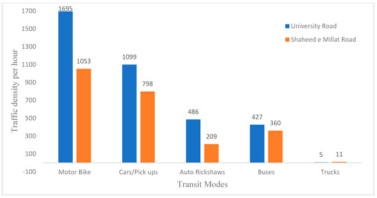 Figure 3 shows the average density of different modes of commute along the two roads. As can be seen from the figure, the average traffic flow for all modes was always higher along University Road than on Shaheed-e-Millat Road, except for the heavy- diesel vehicles (e.g., trucks, etc.), which were higher on the Shaheed-e-Millat road. Still, the average BC concentrations were higher along University Road than Shaheed-e-Millat Road. Other researchers, such as Song et al. (2013) [31] and Wang et al. (2011) [32], reported heavy-duty diesel vehicles to be the major contributor to BC exposure on roads. However, the relatively lower numbers of these vehicles on the two roads observed in our study reduced the possible impact on BC concentrations they might otherwise have had.