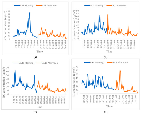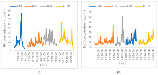 The highest in-vehicle exposure concentrations for all modes of commute were observed during morning rush hours (Figure 4 and Figure 5). Moreover, in-peak sampling (Figure 4a) showed a greater number of higher concentration peaks than the off-peak sampling (Figure 4b). Likewise, BC morning peak hour exposure levels were almost double the levels measured during the afternoon hours. This may be due to high vehicular density, traffic congestion, and less pollutant dispersion in the peak hours, Li et al. (2015) [29] also reported similar trends in their study conducted in Shanghai.