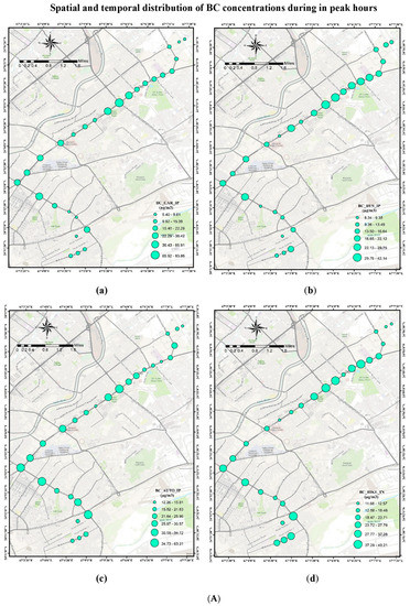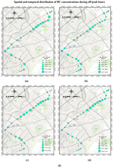 Figure 6 depicts the spatial and temporal distributions of BC concentrations along the routes during office peak (Figure 6A) and off-peak hours (Figure 6B). Spatial variance maps were constructed for locations with considerable changes in exposure values, i.e., repeating or resembling exposure values were not shown in the final maps. The geographical point locations (designated as P1–P28, Figure 2) were 3–5 min apart, depending upon the mode of commute used. Each circular point with different color gradients corresponds to a specific average BC concentration at that location, representing the spatial variation of BC levels at different geographical locations of the routes. Figure 6A reveals the in-peak spatial distribution level of BC, which is higher than the off-peak spatial distribution (Figure 6B); this variation is mainly due to the increased vehicular intensity levels, road congestion, and more frequent traffic jams during peak hours.