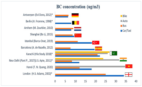 Figure 7 shows a comparison of BC concentrations observed along the roads of Karachi with those reported for various megacities of Asia and Europe. The average BC exposure concentrations in Karachi were comparable to other Asian cities except for Shanghai. However, the concentrations were higher than most of the European cities apart from London, which showed higher levels of elemental carbon during the winter season, possibly due to less efficient vehicle engines and more stable meteorological conditions during the winter season, as reported by another researcher [33].