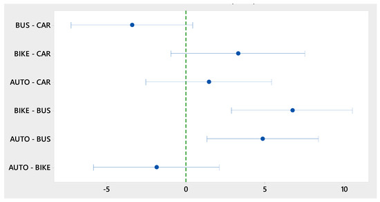 The means of the different commute pairs (bus-car, bike-car, auto-car, bike-bus, auto-bus, auto-bike) were compared using Post Hoc statistical tests (also known as multiple comparisons). Figure 8 shows the ANOVA test result at α = 0.05, with Tukey simultaneous confidence intervals. A null hypothesis (Ho) and an alternative hypothesis (Ha) were determined before the analysis, with Ho stating that all mean of the variables are equal and Ha declaring that the mean of the variables is not equal and there exists at least one inequality. The overall adjusted p-value of < 0.001 indicates that the null hypothesis can be rejected and concludes that the group means are not all equal.