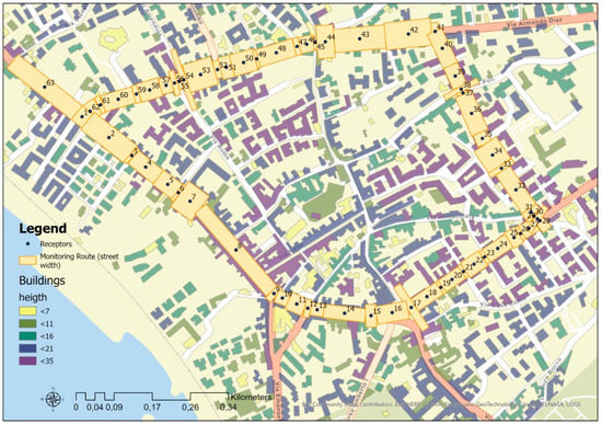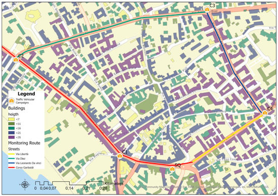 Map of the selected neighborhood of the City of Portici including footprint of the buildings with their height, the monitoring route—Via Libertà (yellow line), Via da Vinci (blue line), Via Diaz (green line), Corso Garibaldi (red line) —and the locations of the traffic vehicular campaigns.