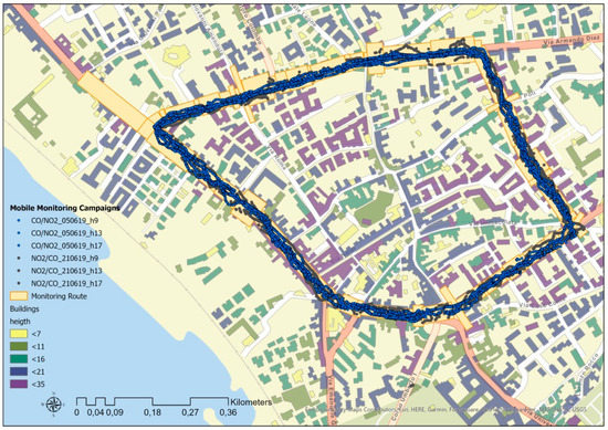 Maps of the mobile monitoring campaigns along the selected monitoring route.