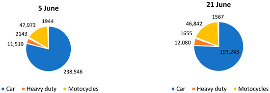 Analyzing the single campaign, on 5 June, the greatest traffic volume has been recorded in the evening hour (17:00–18:00) with 105,539 vehicles, while on 21 June, the greatest number of vehicles has been recorded in the lunchtime hour (13:00–14:00) with 88,610 vehicles.