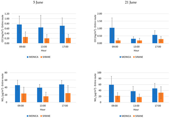 Aggregating the concentration data on the entire monitoring route and for each monitored rush hour, it has been observed that the measured concentrations of both CO and NO2 have an overall average value higher than the estimated average concentrations. In particular, this difference is higher by a factor of 3 for CO concentrations, while for NO2 concentrations the factor is 2. The graphs of Figure 6 show these results for each monitored hush hour. The error bars are calculated as the standard deviation of the time-averaged concentrations for each segment.