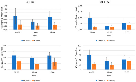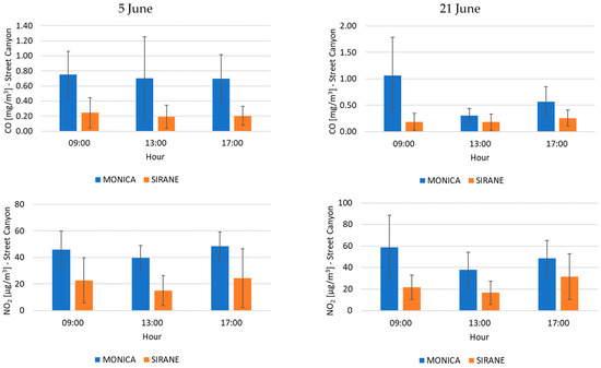 In relation to street canyon segments, we have observed that the difference factors between the mean recorded and simulated concentrations increase for both CO and NO2 compared to the factors observed for the entire route, exactly from 3 to 3.3 for CO and from 2 to 2.3 for NO2. On the contrary, in relation to open street segments, the difference factors decrease compared to the related factors calculated along the entire route, exactly from 3 to 2.5 for CO, and from 2 to 1.9 for NO2. The graphs of Figure 7 and Figure 8 show these differences for each monitored rush hour.