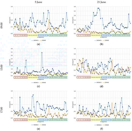 It is known that these events can occur systematically at certain places or can be more accidental. If they are systematic, they are usually modeled by SIRANE as well as captured by MONICA. Otherwise, if they randomly occur, they might not be modeled by SIRANE, especially if they are sharp peaks, while they are captured by MONICA. Just as an example, looking at the peak at segment ID 33 in the CO profile of Figure 9c, it is evident that this peak is captured in its high magnitude by MONICA while smoothed by SIRANE. Most probably, that is one of those accidental events above specified.