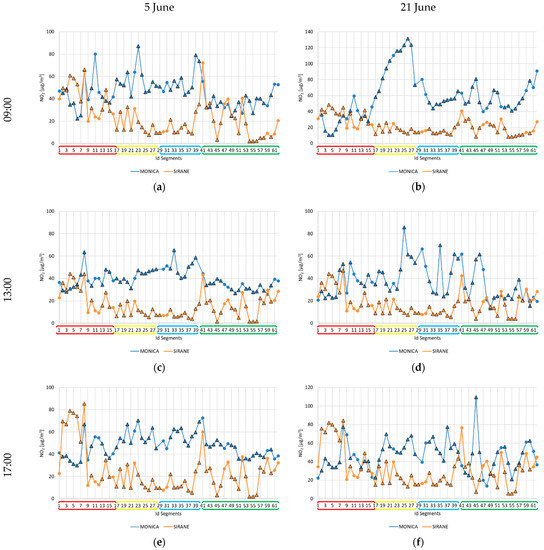Comparison between MONICA (blue line) and SIRANE (orange line), for NO2 pollutant: (a) at 9 am on 5 June; (b) at 9 am on 21 June; (c) at 1 am on 5 June; (d) at 1 am on 21 June; (e) at 5 pm on 5 June; (f) at 5 pm on 21 June. Triangles are street canyons and circle open roads. The ID receptors from 1 to 16 (red lines) are referred to the road segment Corso Garibaildi; IDs from 17 to 28 (yellow lines) to the road segment Via Libertà; IDs from 29 to 40 (blue lines) to the road segment Via DaVinci; IDs from 41 to 61 (green lines) to the road segment Via Diaz.