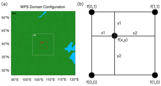 (a) Schematic diagram of triple simulation domains of numerical WRF simulation and (b) schematic diagram of interpolation method.
