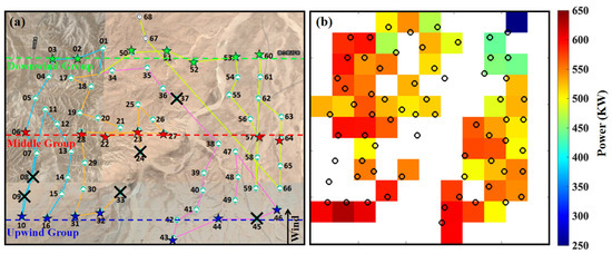 (a) The grouped wind turbines along southerly wind in the Gobi grassland wind farm, with upwind group turbines 10, 16, 31, 32, 42, 44, 46, middle group turbines 06, 22, 23, 27, 28, 57, 64, and downwind group turbines 02, 03, 50, 51, 52, 53, 60. (b) Distribution of the average generated powers in September 2021.