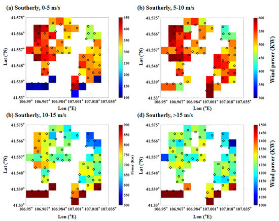 (a–d) show the distribution of wind power of the Gobi grassland wind farm in groups of 0–5 m/s, 5–10 m/s, 10–15 m/s, and >15 m/s.