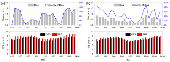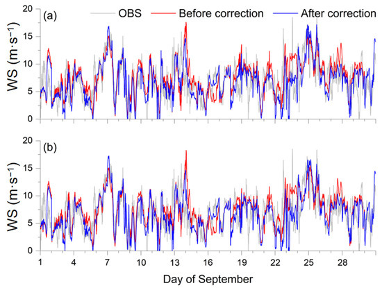 Hourly wind speed correction of nearest replacement result using AVT methodology. Panel (a) is the result before AVT correction; panel (b) is after AVT correction.