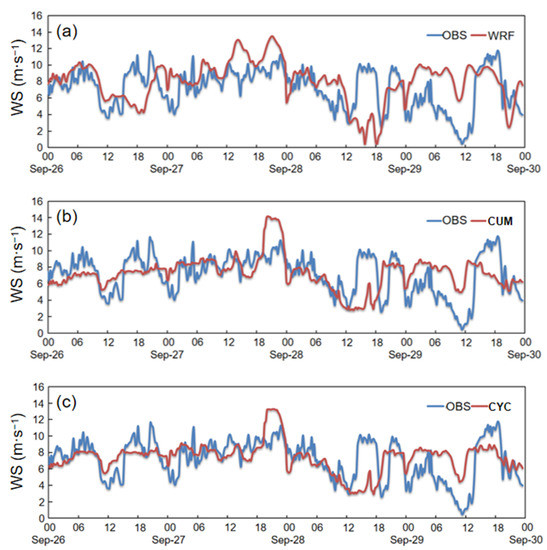 (a) Turbine-observed (OBS) and WRF-simulated wind speed (WS, m/s); (b) turbine observed (OBS) and CatBoost_CUM-predicted wind speed (WS, m/s); (c) turbine observed (OBS) and CatBoost_CYC-predicted wind speed (WS, m/s).