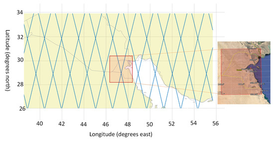 CALIPSO 16-day repeat ground tracks near Kuwait City. The orange box denotes the region of study centered near Kuwait City center.