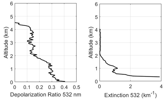 The figure shows the depolarization ratio (left side) and the extinction profile (right side) of the SDS from a single source in the summer of 2009. These are typical profiles of dust layers during these SDS events. The figure to the left shows a large depolarization close to the surface of 25 to 40%, and the layer above it has a depolarization of about 15%. These profiles are for dust features shown in the image in Figure 4. The extinction profile shows a large extinction near the surface influenced by the surface return and an extinction of about 1.0 km−1 at the top of the first layer. The extinction reduces considerably at the top of the layer.