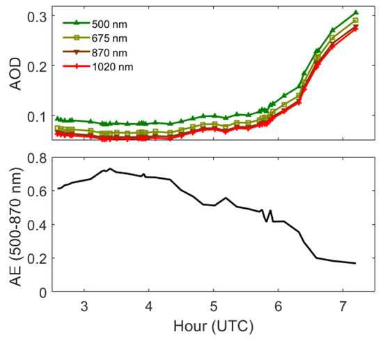 The dust storms were also observed by the the aerosol robotic network (AERONET) [29] measurements. AERONET is an automatic robotic Sun- and sky-scanning measurement network that has grown rapidly to over 200 sites worldwide. AERONET uses multiangle radiance measurements to retrieve the discrete aerosol size distributions in 22 size bins ranging from 0.05 to 15 µm and the complex refractive index. AERONET provides a database with a fine temporal resolution, albeit for column rather than vertically resolved measurements The network has the important features of uniform data collection, calibration, and data processing procedures. Figure 4 below shows the onset of the dust storm on 22 June 2018. The aerosol optical depth (AOD) measurements show low optical depths from 3:00 to 6:00 UTC (6:00 a.m. to 9:00 a.m. local time). The AOD measurements increase by a factor of 3 from 0.1 to 0.3 in one hour between 9:00 a.m. and 10:00 a.m. local time. The onset of the SDS is around 10:00 a.m. (6:00 UTC). This is further confirmed by the precipitous drop in the Ångström Exponent (AE), the normalized logarithmic ratio of the optical depths at 500 nm and 870 nm. The AE is small for large particles and large for small particles. Figure 4 shows that there was a rapid increase in the number of large particles (dust) at 9:00 a.m. local time in Kuwait City on 22 June 2018 as will be shown in Section 3 of this paper from CALIPSO observations.