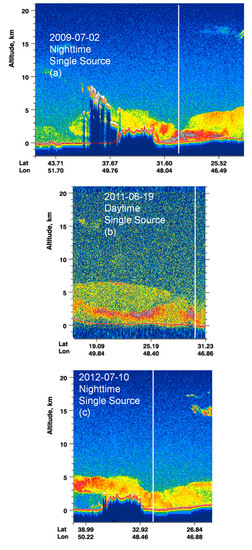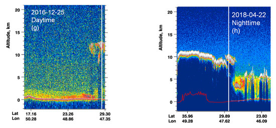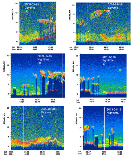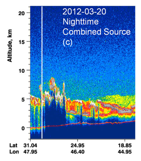 Figure 7c,d are nighttime images of days when there was a dust storm on record from unspecified sources. Because of the active convective storm activity over Kuwait City on 15 May 2009, the opaque clouds completely attenuate the Lidar signal and the dust below the cloud is not visible from above. Similarly, clouds above Kuwait City obscure the thin dust layers resulting from the dust storm recorded on 15 December 2011 (Figure 7d). However, a thin dust layer is visible to the south of Kuwait City. Both images show the limitations of the Lidar in observing thin aerosol layers below strong clouds. However, in each case we can see the aerosol layer extending over cloud free areas.