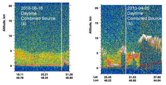 - Liu, Z.Y.; Vaughan, M.; Winker, D.; Kittaka, C.; Getzewich, B.; Kuehn, R.; Omar, A.; Powell, K.; Trepte, C.; Hostetler, C. The CALIPSO Lidar Cloud and Aerosol Discrimination: Version 2 Algorithm and Initial Assessment of Performance. J. Atmos. Oceanic Technol. 2009, 26, 1198–1213. [Google Scholar] [CrossRef]