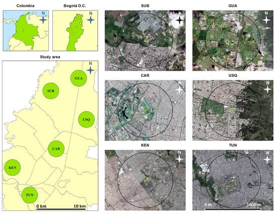 Location of the monitoring stations established in the study megacity (Google Earth Pro, https://earth.google.com/web/search/Bogot%C3%A1, accessed on 28 October 2018).