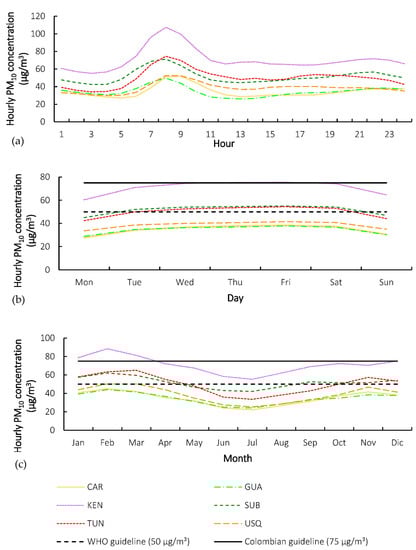 Monthly, the findings showed that PM10 concentrations in all monitoring stations complied with the limit established by the Colombian guideline, except for the KEN station (average = 81.5 μg/m3), during the most critical interval (January to March). The WHO guideline value was only complied with by the GUA, CAR, and USQ stations. The SUB and TUN stations only complied with the WHO guideline value during the least critical interval (June to August) and in May. Finally, the KEN station did not show monthly PM10 concentrations lower than the guideline value established by WHO. According to the information observed for monthly PM10 concentrations, it was possible to classify the monitoring stations according to their pollution degree, as follows: high pollution = KEN (59.6–75.5 µg/m3), medium pollution = TUN and SUB (43.6–59.6 µg/m3), and low pollution = CAR, GUA, and USQ (27.7–43.6 µg/m3).
