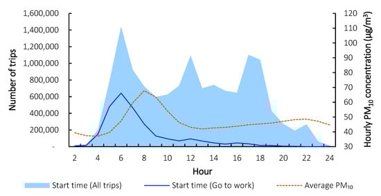 The above findings suggested that PM10 pollution peaks were possibly associated with the displacement of the inhabitants from their workplaces (via motor vehicles). This work displacement occurred between 5:00–9:00 h, according to the 2015 Mobility Survey conducted by the megacity []. A correlation analysis detected very strong associations between the number of work trips and hourly PM10 concentrations (rs = 0.904; p-value < 0.05). The previous analysis considered a two-hour delay for observed hourly PM10 concentrations. In this study, it was visualized that at 6:00 h the peak of work trips occurred in the megacity (642,369 trips), and two hours later (8:00 h), the PM10 concentration peak was observed (Figure 3). From the development of a linear regression model, it was detected that, on average, for every 100,000 trips there was an increase in the hourly PM10 concentration of 4.0 μg/m3. This was under the scenario of a two-hour delay (y = 4 × 10−5x + 42.3; x = number of hourly trips, y = hourly PM10 in μg/m3; R2 = 0.817). The previous analysis considered all observed hourly information. Considering only the information between 1:00 and 12:00 h, the time in which the concentration peaks were observed, a better correlation between these two variables was found (rs = 0.986; p-value < 0.05). In other words, for every 100,000 trips, the hourly PM10 concentration increased by 5.0 µg/m3 (y = 5 × 10−5x + 38.7; R2 = 0.973). Ramirez et al. [] reported that motor vehicle-related emissions (combustion and resuspended PM) were the main PM10 source (≈50%) in the megacity. Finally, two additional peaks in the number of work trips (12:00 h and 17:00 h) were observed, which were not associated with increases in hourly PM10 concentrations. This PM10 trend could be associated with the hourly variation of the mixing–layer height. Studies have been carried out in the megacity that reported mixing–layer heights between 722 m and 1085 m during the hourly PM10 concentration peaks (8:00 h). Conversely, between 12:00 h and 17:00 h, these studies reported mixing–layer heights greater than 2500 m []. Therefore, the mixing–layer height possibly conditioned the PM10 dispersion.