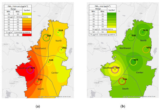 Average spatial variation of PM10 concentration in Bogotá D.C. during (a) the most critical month (February) and (b) the least critical month (July).