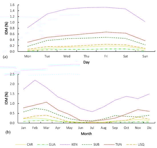 Temporal variation of (a) daily and (b) monthly IDM in Bogotá D.C.