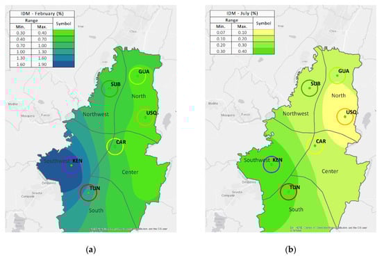 The spatial behavior of IDM in the megacity during the most critical month (February) and the least critical month (July) was characterized by lower values in the eastern zone, which were increasing toward the western zone and reached the highest values in the southwestern zone (Figure 6). Thus, the areas of the megacity were classified as follows, according to the values of IDM: (i) low IDM = northern zone (0.105% in July and 0.403% in February), central zone (0.151% in July and 0.451% in February), and northwest zone (0.148% in July and 0.704% in February); (ii) medium IDM = southern zone (0.274% in July and 0.862% in February); (iii) high IDM = southwestern zone (0.336% in July and 1.42% in February). These results were consistent with the number of mortality cases from ARI in children under 5 years of age, as reported for 2018, where the highest number of cases was reported in the localities of Kennedy, Usme, and Ciudad Bolívar. This was in the southwest part of Bogotá D.C. []. Considering that the northern zone of the megacity was the one that showed the lowest IDM values and the southwestern zone showed the highest, it was detected that IDM in the southwestern zone was 3.36 times higher than IDM in the northern zone. Therefore, the results suggested a significant spatial variation in IDM in Bogotá D.C.