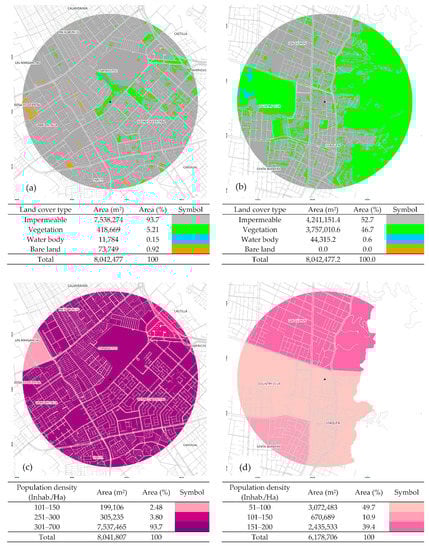Variation of land cover and population density in the monitoring stations KEN (a,c) and USQ (b,d).