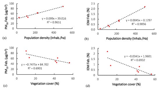 Linear regression models (radius = 800 m) for the following relationships in February: (a) population density and PM10, (b) population density and IDM, (c) vegetation cover and PM10, and (d) vegetation cover and IDM.