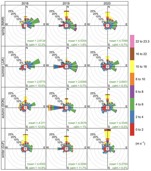 Wind direction and wind speed frequency are shown in Figure 2 from 2018 to 2020 at the AQMS. In summer, the prevailing winds are from the northeast (NE) and east (E), with a frequency of 10 to 20%. In autumn and winter, the dominant wind direction is N, with wind speeds from 6 to 22 m/s. Southeast (SE) winds were common in the spring season. Overall, The N and ENE winds were the most frequent from 2018 to 2020. These characterize the sea breeze circulation. E and ESE winds were also common and represent airflow from the location of “Bahía Sur”. NW, NNW, and N winds indicate airflow from the “Bahía Norte”. The remaining wind directions indicate the contribution of SO2 from other emission sources close to AQMS.