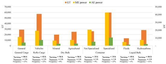 Parameters to determine SO2 atmospheric emission are shown in Figure 3. According to the typology of ships in the port of Veracruz, we have considered the time spent in maneuvering and berthing positions, frequency, GT, ME, and AE power to identify their distribution on an annual average from 2018 to 2020. AE power is less than ME power because the ship propels through the ME, while the ship operation (loading and unloading of merchandise) corresponds to the AE. Atmospheric emissions are higher in the docking position because the frequency, stay times, and GT are important parameters for the atmospheric emission, contrary to the maneuvering position where two engines are in operation, but the time in this position is approximately 1 h. The combination of arrival frequency, GT, and docking time is the key to the atmospheric emission level. Considering the frequency of Specialized Container (23%) with GT above 60,000 and shorter stay time compared to other vessels, the highest atmospheric emission will be obtained, followed by RoRo Cargo. The lowest atmospheric emissions will come from Bulk Dry (Mineral) and Liquid Bulk (Fluids) because they have a GT between 13,000 and 20,000 with residence times greater than 24 h, but their frequency is 6 to 8%.