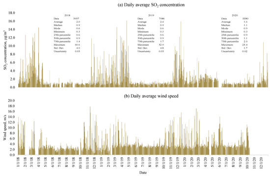 AQMS recording for (a) SO2 ambient concentration and (b) wind speed from 2018 to 2020.