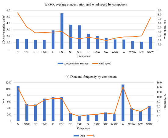 SO2 analysis with respect to the meteorological data was performed using SO2 temporal profiles, wind speed, and direction from AQMS. Figure 7a shows the highest SO2 concentration occurred when the wind came from an ESE direction with 4 m/s. The wind speed is highest in the NNW, N, and NNE directions of 5 m/s to 9 m/s. The lowest concentrations were measured with the wind coming from NE to WNW, with speeds of approximately 2 m/s. According to the database from AQMS (Figure 7b), over 1000 were N (frequency of 14%) and W (frequency of 14%); however, the SO2 concentrations were minimal (1.5 μg/m3) in those directions. There is no significant contribution from S components. The E and ESE directions occurred 10% of the time and ranged from 4 μg/m3 to 5.5 μg/m3 SO2 concentrations prevail in those components.