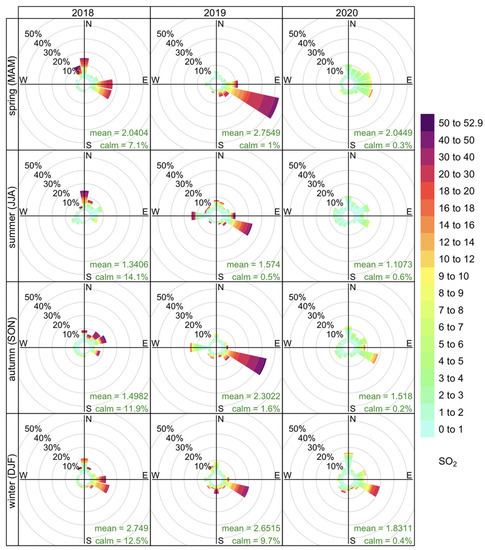 The SO2 distribution for each season according to wind speed and direction is shown in Figure 8. The highest SO2 concentrations were observed during Spring 2019, with SE winds. The frequency was 45%. Given this consideration, we decided to evaluate the air quality during this season. Also, Autumn and Winter represented an important contribution of SO2 to AQMS, but the wind speed frequency is minimal in those seasons.