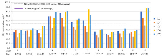 - Norma Oficial Mexicana (NOM). NOM-020-SSA1-2019. Salud Ambiental. Criterio Para Evaluar la Calidad del Aire con Res-pecto a Dióxido de Azufre (SO2). Diario Oficial de la Federación, México. 2019. Available online: https://www.dof.gob.mx/nota_detalle.php?codigo=5568395&fecha=20/08/2019#gsc.tab=0 (accessed on 29 July 2022).