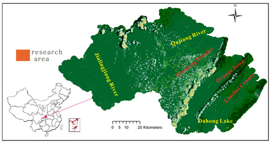 Guang’an City is located in a hilly area in the middle of Sichuan Province with a parallel ridge valley area in the east. Within the geographic range of 105°56′–107°19′ E and 30°01′–30°52′ N, it is an area dominated by hilly landforms, with an elevation of 400–1500 m. It is in a subtropical monsoon region with a warm climate and abundant precipitation. There are many lakes and rivers with abundant products. The plants are mostly subtropical evergreen broadleaved forests. The Qujiang River in the middle of Guang’an City and the Jialing River in the southwest are tributaries of the Yangtze River. The NE–SE-oriented Huaying Mountain, Tongluo Mountain, and Mingyue Mountain are arranged in parallel to the east of Guang’an. Guang’an covers an area of 6393.22 km2, consisting of one city, three counties, and two districts. The total population in 2017 was 4.647 million, and the gross national product (GDP) in 2018 was 125.02 billion CNY. Guang’an City is a national garden city, enjoying a good overall ecological environment. The overall ecological structure of Guang’an forests and lakes is mainly distributed across the city, constituting a planar area with high land ecological quality. There are areas with high linear land ecological quality, such as Qujiang River in the middle and Jialing River in the southwest, in addition to the adjacent areas. Basic farmland and economic forest areas are of good land ecological quality. Cities and towns with relatively more construction land and their surrounding areas are of low and medium land ecological quality. A geographic map of Guang’an is shown in Figure 1.