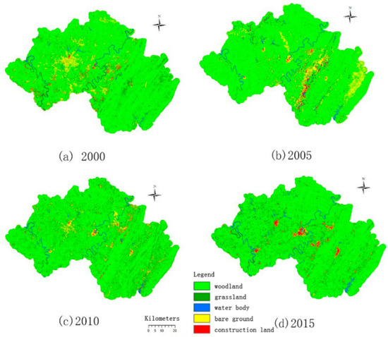 The land classification map of the study area in the four years of 2000, 2005, 2010, and 2015 [13]. (a) The land classification map of the study area in 2000 (b) The land classification map of the study area in 2005 (c) The land classification map of the study area in 2010 (d) The land classification map of the study area in 2015.
