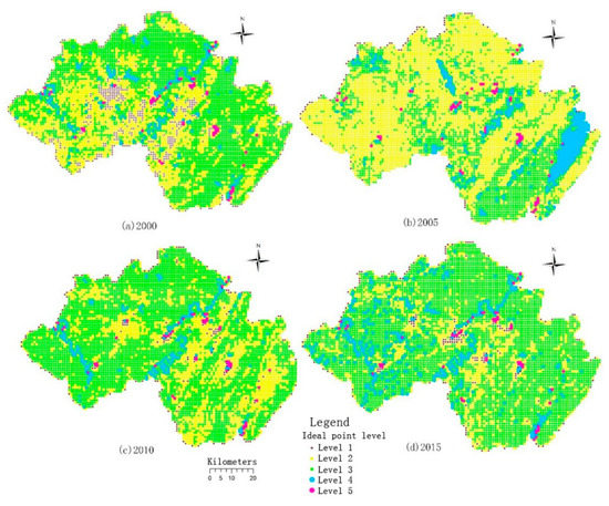 This paper used MATLAB2016a software programming to calculate the ideal point value (land ecological quality evaluation value) of each evaluation unit, and then the natural breakpoint method in ArcGIS 10.3 software was used to classify the ideal point value of each kilometer grid. There are 7012 evaluation units within the scope of Guang’an City, and the ideal point value of each evaluation unit was divided into five grades from low to high using the natural break point method: grade 1 (poor), grade 2 (general), grade 3 (medium), grade 4 (good), and grade 5 (excellent), along with five other ecological quality grades. The grade maps of the ideal points of land ecological quality in four phases of 2000, 2005, 2010, and 2015 are shown in Figure 3.