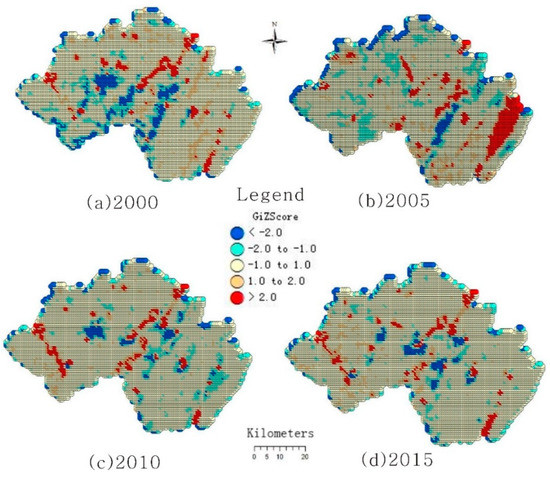 The steps to obtain the hot spot values were as follows: (1) take the land ecological quality evaluation value (ideal point value) as the basic data; (2) use ArcGIS 10.3 software and the hot spot analysis tool in the toolbox (Arctoolbox) to calculate the hot and cold spot values of the ideal point values of land ecological quality in 2000, 2005, 2010, and 2015; (3) render the cold and hot spot values into a map by layers, and obtain the spatial differentiation maps of hot spots in Guang’an in 2000, 2005, 2010, and 2015 (as shown in Figure 4).