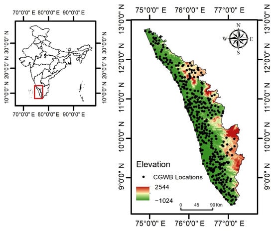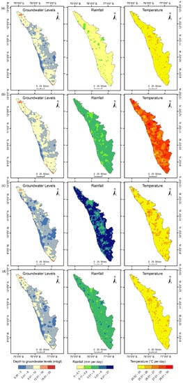 The whole life cycle of flora and fauna is impacted by hydrological and climatological changes. The combined impact is a new field of study known as hydro-climatology. All the elements of the environment are components of the water cycle, which must constantly be in balance. Life on Earth needs water to survive and be sustained, and the largest freshwater source is groundwater. In India, more than 80% of the country’s needs for drinking water and 60% of its agricultural needs are met by groundwater. In the southernmost state of India, Kerala, freshwater resources are reported to be abundant. As Kerala customarily has a well for each house, the number of groundwater extraction wells has continued to grow throughout time []. The idea of determining the causes of oscillations in the groundwater table has arisen as a result of water shortages. Aquifers in Kerala have water depths that range from 0 to 40 mbgl. After the monsoon season, the ground water levels in most areas will be less than 5 mbgl, and subsequently, as a result of extraction, they will fall between 5 and 10 mbgl [].