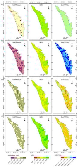The average Soil Moisture, NDVI, and SMVITERA index during (a) January, (b) April, (c) August, and (d) November.