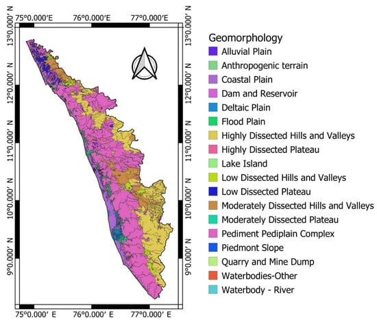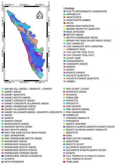 To understand the hydro variability, which assists in determining the land setting under each analyzed place, the static layers of the lithology and geomorphology are examined. The features of a single rock unit found in the Earth’s crust are the subject of the subfield of lithology in Earth sciences. Geomorphology is the study of landforms, including their formation, shapes, and underlying deposits. Bhukosh (https://bhukosh.gsi.gov.in/Bhukosh/Public, accessed on 20 February 2022), a portal and gateway to all geoscientific data of the Geological Survey of India (GSI), is where the lithology and geomorphology of the state of Kerala are found.
