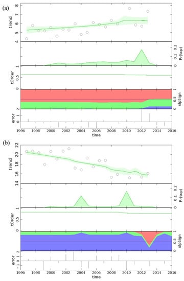 The BEAST is performed over the 385 sites and individually for the JAAN months. The time series has 21 time points and spans the years 1996 to 2016. The groundwater level dataset is fitted with a piecewise linear trend even in the presence of missing values using BEAST. At each of the 21 time points, the slope of this fitted trend is also determined. The sites having the percentage areas greater in the positive or negative slope are chosen as the locations for further analysis. This positivity or negativity is also verified by linearly modelling the trend data points. Over the studied 385 locations, a combination of probabilities is obtained. During the month of January, the Well number 1 (Konnakuzhi-iii) situated in the Ernakulam district showed the greater probability of groundwater level trend to be zero (Figure 6a). That is, the green area indicating zero slope dominates in the graph. The percentage areas were 7.9% for positive slope, 58.7% for zero slope, and 33.4% for negative slope. The linear modelling showed the slope to be −0.0068, approximately zero, and the negative slope contribution is visible as the second highest percentage as well. Another example is during the month of April on the well number 170 (Kottanadu) situated in Pathanamthitta district, which showed the areas of green and blue approximately to be the same (Figure 6b). This means that there exists an approximately equal probability for the slope to be zero and negative. The percentage areas were obtained as 12.1% for positive slope, 43.3% for zero slope, and 44.6% for negative slope. We are typically interested in the well locations where the probability for negative or positive is the highest over each site. One such example is well location 20 (Pattambi) situated at Palakkad district, which has a greater percentage for positive slope during the month of April (Figure 7a), and well location 32 (Poonkulam) in Thiruvananthapuram district, which has a greater percentage for negative slope during the month of August (Figure 7b). The percentage areas are around 63.9% and 79.9%. The linearly modelled slopes are 0.0634 and −0.246.