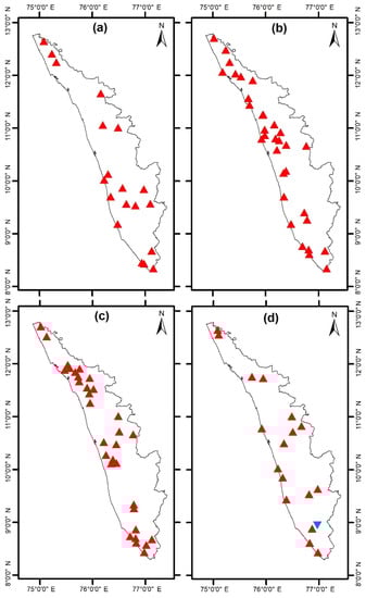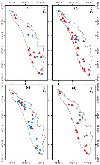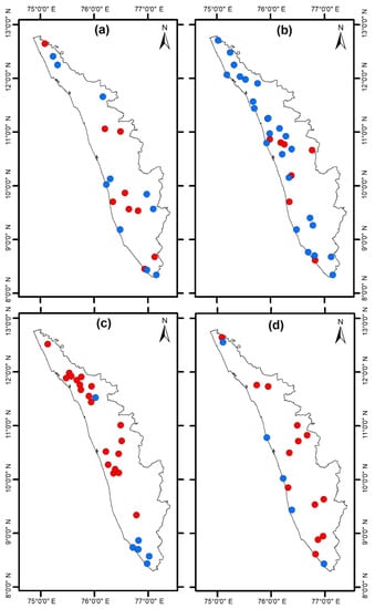 The Global Monthly Soil moisture (in millimeters) from NOAA-NCEP-CPC-GMSM is available as GeoTIFF at the IRI digital library maintained by the International Research Institute of Climate and Society, Columbia Climate School (http://iridl.ldeo.columbia.edu/SOURCES/.NOAA/.NCEP/.CPC/, accessed on 28 January 2022). Soil moisture is assessed by a one-layer hydrologic model [], which uses observed precipitation and temperature as inputs and computes the soil moisture, evaporation, and runoff []. The monthly raster files are downloaded for north latitudes 8° N to 13° N and east longitudes 74° E to 78° E, having a spatial resolution of during the years 1996 to 2016 and in the JAAN months. In the Geographic Information System (GIS) environment, the grid point values are extracted and interpolated with the Inverse Distance Weighted (IDW) technique. IDW is calculated using the equation []: